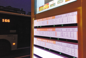 鄞州繁裕二村站臺(tái),公交車到站信息實(shí)時(shí)顯示在屏幕上。記者 唐嚴(yán) 攝