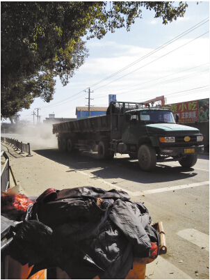 “這里的灰塵實(shí)在太大了,我在這里工作半年,每天都得戴著口罩。以前好幾個(gè)人就是因?yàn)檫@里環(huán)境太差,不愿干才走的。”得知記者來采訪此事,這位環(huán)衛(wèi)工人指著遠(yuǎn)處說,馬路那頭有一個(gè)沙場,每天有運(yùn)沙的工程車進(jìn)進(jìn)出出。“對面還有一片空地,很多工程車就停在里面。車子一開過,全是灰。”說話間,記者看到陸續(xù)有三輛工程車呼嘯而過。