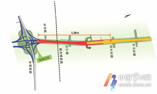 世紀大道快速路(東苑立交-百丈東路南)一期工程為寧波市重點城建項目。工程南起東苑立交,北至百丈東路,建設(shè)全長約1300米,道路紅線寬度108米。