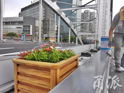 橋拱下隔離帶中的盆栽花藝清新而優(yōu)雅。