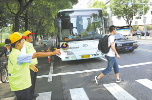 8時,斑馬線上車流不息。幾位形象大使穿著“文明出行”志愿背心,開始上路開展勸導(dǎo)活動。