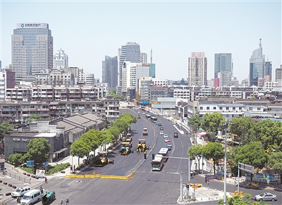 昨天,驕陽似火,城市核心區(qū)重要南北向道路解放路上一派繁忙施工景象:一臺大型瀝青攤鋪機不斷將滾燙的瀝青攤鋪在水泥路面上,工作人員在路面忙著指揮車輛、壓平路面。