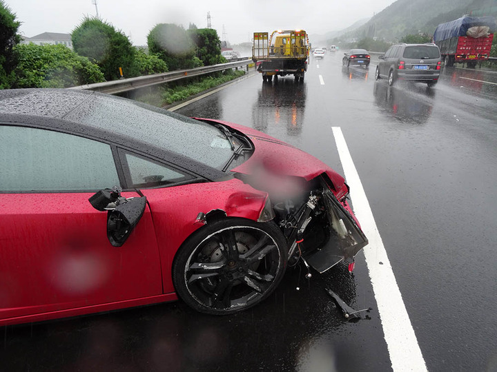 6月13日中午11點30分左右,周師傅駕駛價值400多萬元的紅色蘭博基尼超級跑車由杭州上高速去寧波,途經(jīng)280k處時,由于雨量較大,加上車速過快,蘭博基尼輪胎打滑,徑直撞上了集卡車的左前輪,在高速上轉(zhuǎn)了好幾個圈之后才停下,損毀嚴重。