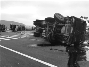 發(fā)生事故后,運(yùn)土車與水泥槽罐車同時側(cè)翻在地,汽車零件散落一地,現(xiàn)場一片狼藉。