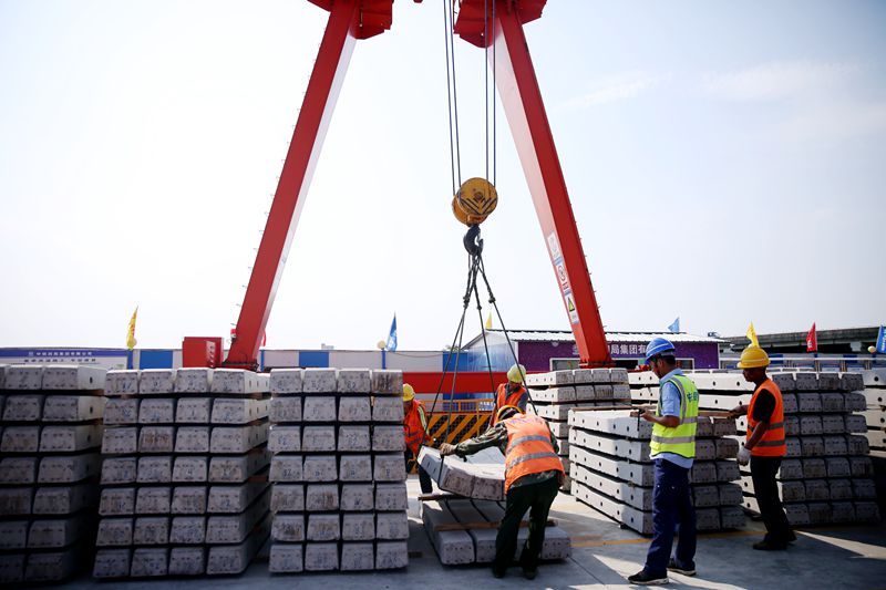 下午,記者看到作業(yè)人員將鋼軌、軌枕、扣件拼裝成軌排,再用龍門吊將拼裝好的軌排吊至軌道車上。所有施工流程一氣呵成,井井有條。