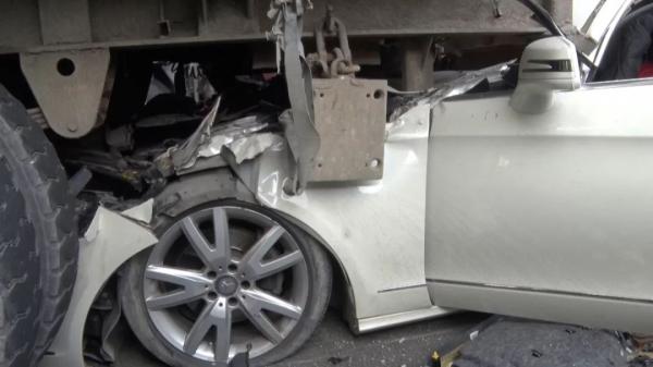 事故現(xiàn)場(chǎng)一片狼藉,路面上全是撞壞的轎車零部件和玻璃殘?jiān)I車車頭與貨車尾部緊緊地“咬”住,鉆到了貨車底下。奔馳車車頭面目全非,前后擋風(fēng)玻璃全部粉碎,氣囊彈出,前排更是被擠壓得嚴(yán)重變形。聞?dòng)嵹s來的當(dāng)?shù)亟痪⑾篮图本柔t(yī)生立刻實(shí)施現(xiàn)場(chǎng)救援。