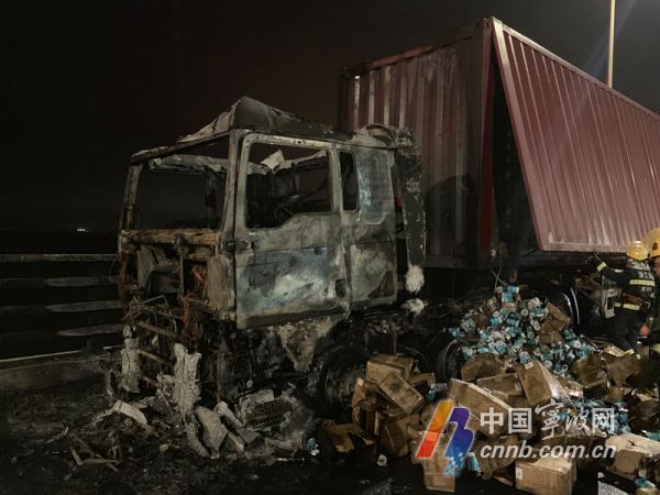 無獨(dú)有偶,今天凌晨0時(shí)18分左右,杭州灣跨海大橋?qū)幉ǚ较騥1385+300m處也發(fā)生了一起車輛自燃的事故:一輛滿載文具用品的重型半掛車突然起火,燒毀了整個(gè)車頭與部分箱體。