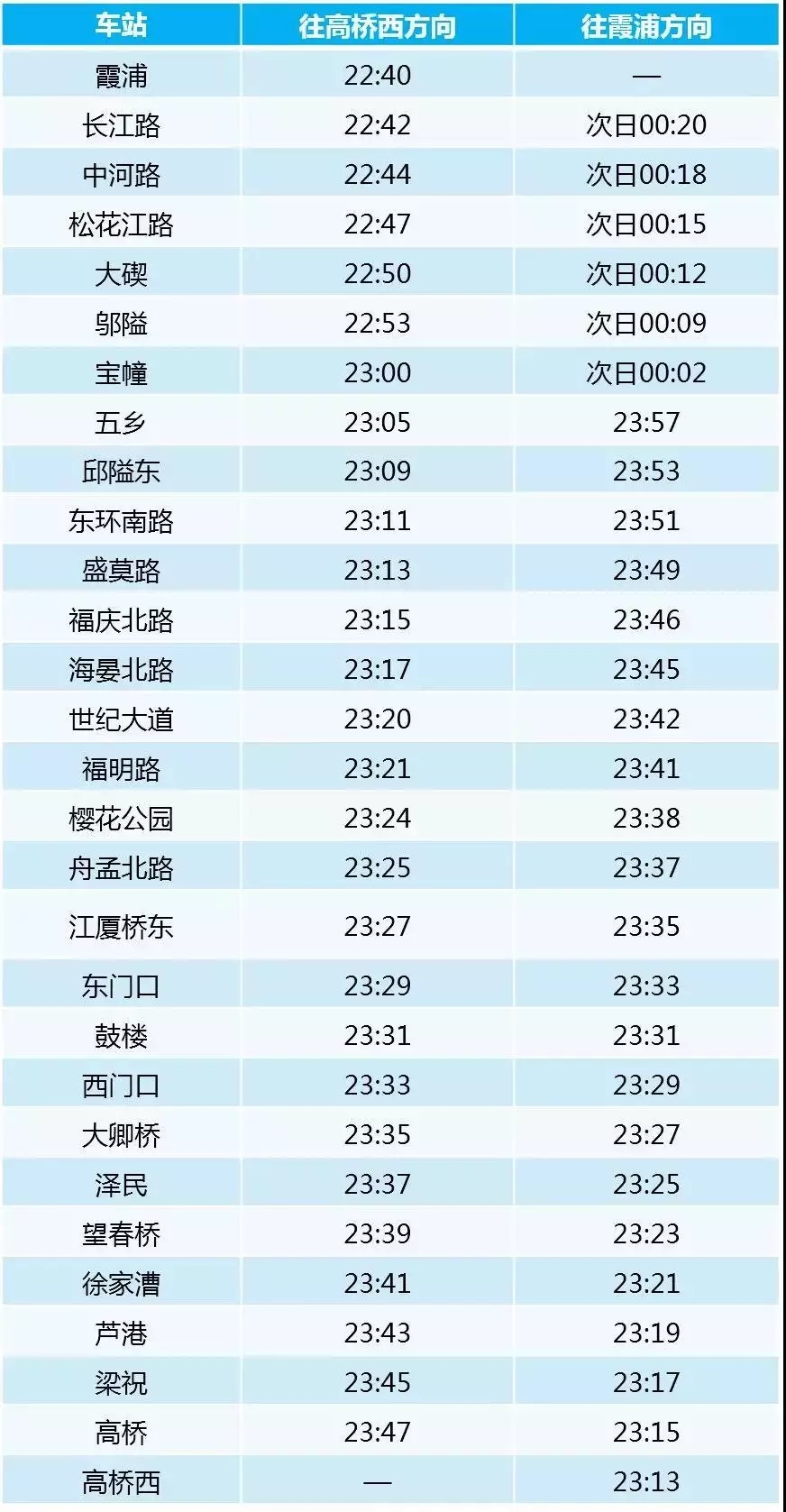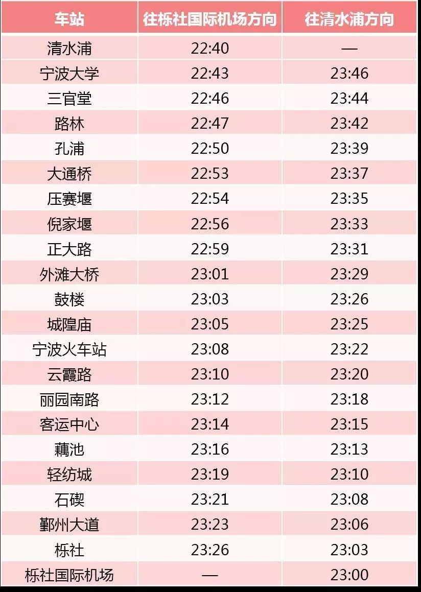 軌道交通在31日當(dāng)天,1號(hào)線高橋西往霞浦方向,末班車時(shí)間為23:13,霞浦往高橋西方向,末班車時(shí)間為22:40;2號(hào)線一期櫟社國(guó)際機(jī)場(chǎng)往清水浦方向,末班車時(shí)間為23:00,清水浦往櫟社國(guó)際機(jī)場(chǎng)方向,末班車時(shí)間為22:40;3號(hào)線一期,兩個(gè)始發(fā)站末班車時(shí)間均為23:00;寧奉線首通段末班車時(shí)間不變。