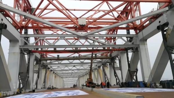 市住建局三官堂大橋項目負(fù)責(zé)人夏偉杰說,1月10日主橋鋼桁梁吊裝到位,11日上午9點完成姿態(tài)調(diào)整,13日晚上4個主要的桁口焊接到位,14日上午進(jìn)行橋面板的焊接。