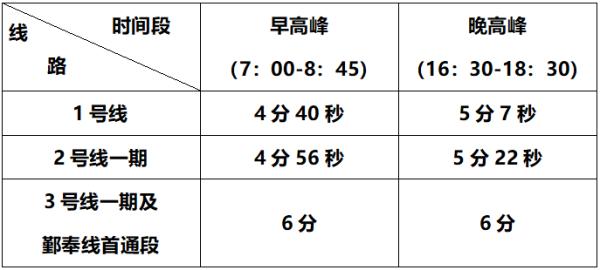 工作日平峰期1號(hào)線(xiàn)及2號(hào)線(xiàn)一期行車(chē)間隔為7分58秒,3號(hào)線(xiàn)一期及鄞奉線(xiàn)首通段行車(chē)間隔為8分;