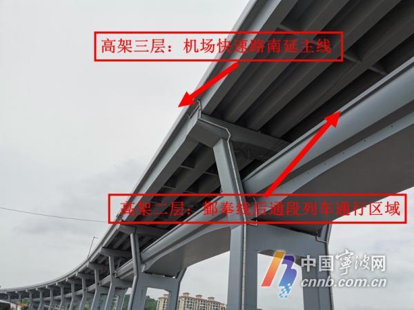 “這,既是地鐵站的頂部,同時也是快速路南延主線的行車路面。”寧波軌道交通建設(shè)分公司業(yè)主代表王國金告訴記者,鄞奉線與寧波機場快速路南延合建于同一高架橋梁上,底層為地面道路,高架二層為軌道交通寧奉城際線,高架三層為機場快速路南延主線,共建段的土建工程由寧波機場快速路南延工程代建。