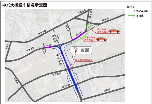 目前,中興大橋(江南路—大慶北路)通行的交通組織為: