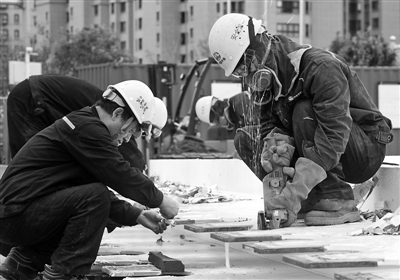 10月2日,在廣德湖北路與新典東路交叉口施工現(xiàn)場,一片忙碌景象。幾名工人戴著防護面具對一片片即將起吊的鋼板進行打砂除銹。不遠處,十幾名工人正在對鋼梁節(jié)段構件進行焊接拼裝。