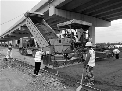 國慶期間,環(huán)城南路西延工程施工現(xiàn)場熱火朝天,工人們正在加快進行高架橋梁附屬結構、地面道路結構等工程施工。
