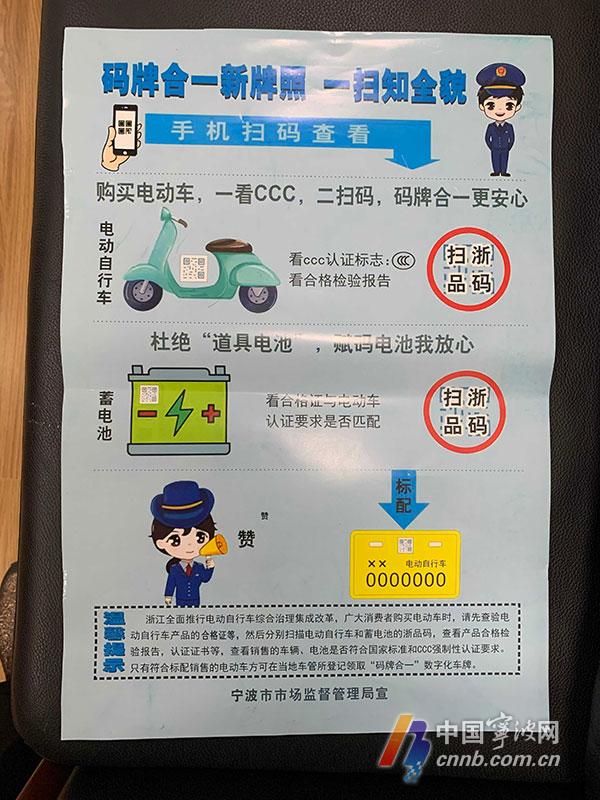 今天上午,記者在海曙區(qū)石碶洪昌電瓶車經(jīng)營(yíng)部看到,在售電動(dòng)自行車和蓄電池上都已賦上了“浙品碼”,掃描電動(dòng)自行車上二維碼后即可獲取車輛圖片、產(chǎn)品合格證明等基本信息及對(duì)應(yīng)的蓄電池類型、品牌、型號(hào)等信息,掃描蓄電池上二維碼后即可獲取對(duì)應(yīng)生產(chǎn)企業(yè)、品牌、型號(hào)等信息,確保車、池符合強(qiáng)制性產(chǎn)品認(rèn)證一致性要求,杜絕銷售過(guò)程中可能出現(xiàn)的“道具電池”、非法改裝等現(xiàn)象。