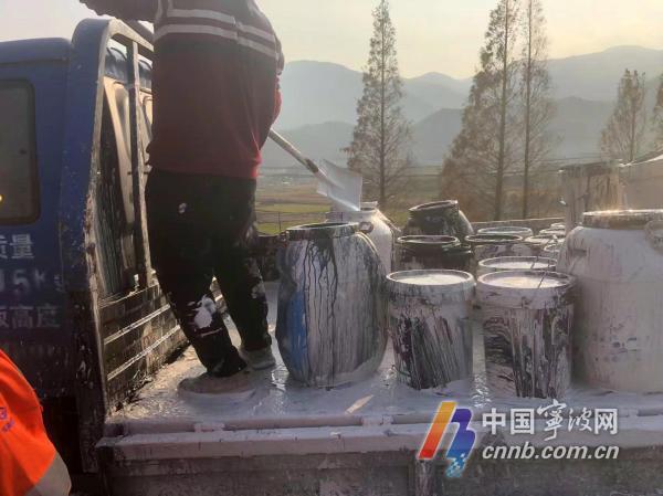 12月11日下午2點左右,在甬莞高速往臺州方向角洞岙隧道出口,發(fā)生一起三車追尾的交通事故。首車是一輛滿載白色涂料的輕型貨車,它被后方重型貨車追尾。然后在巨大的沖擊力下,輕型貨車尾部就如同灑水車一般,將貨斗里近一噸重的涂料全噴灑在高速路面。