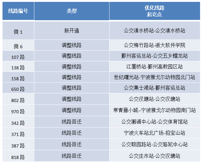從2022年1月起至3月,將新開通公交線路1條,優(yōu)化調(diào)整11條公交線路,具體情況如下表一: