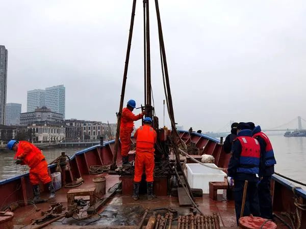 為了加快推進本次作業(yè),寧波軌道交通前期多次與寧波海事局通航管理處及三江口海事處對接溝通,于春節(jié)前取得施工許可證。節(jié)后上班第一天就組織勘察單位先后完成安全教育培訓、施工前交底、船舶安全檢查等各項準備工作,把握春運期間大部分甬江通航船舶停航過節(jié)的契機,于2月11日正式啟動勘察工作,在一周時間完成水上勘察作業(yè)。