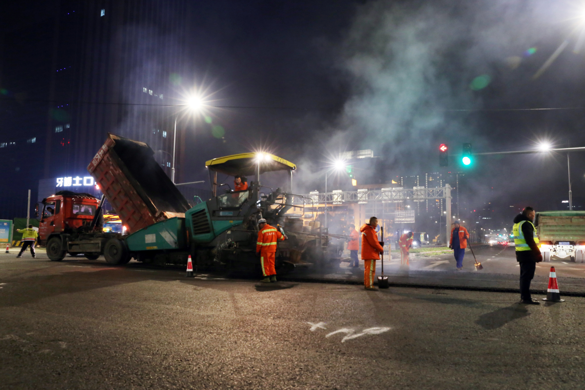 從2月28日晚9時(shí)開(kāi)始,在鄞縣大道天童南路口施工現(xiàn)場(chǎng),近20臺(tái)瀝青車(chē)源源不斷地運(yùn)來(lái)施工材料,經(jīng)過(guò)高溫加熱的瀝青冒出騰騰熱氣,被攤鋪機(jī)傾倒在路面。隨后,工人們“趁熱打鐵”,在推土機(jī)、壓路機(jī)等大型機(jī)械的協(xié)助下,以最快的速度用鐵鍬把瀝青迅速攤平、反復(fù)碾壓,確保道路面層瀝青粘合密實(shí)。至3月1日凌晨5時(shí),該路口完成瀝青攤鋪?zhàn)鳂I(yè),出行環(huán)境大幅提升。