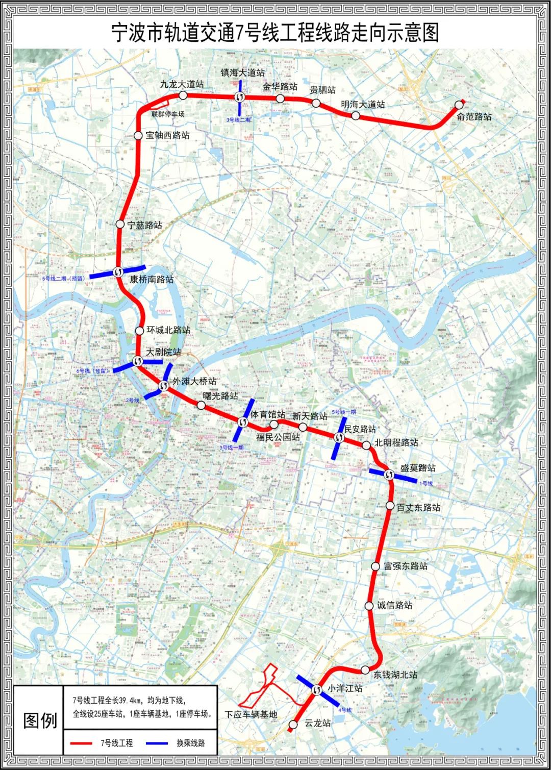 7號線線路南起東錢湖地區(qū),穿越邱隘鎮(zhèn)、東部新城、老外灘、灣頭、莊橋、鎮(zhèn)海新城,最終到達俞范組團,線路依次經過鄞州區(qū)、江北區(qū)和鎮(zhèn)海區(qū)。線路全長約39.4km,全部為地下線,設站25座。