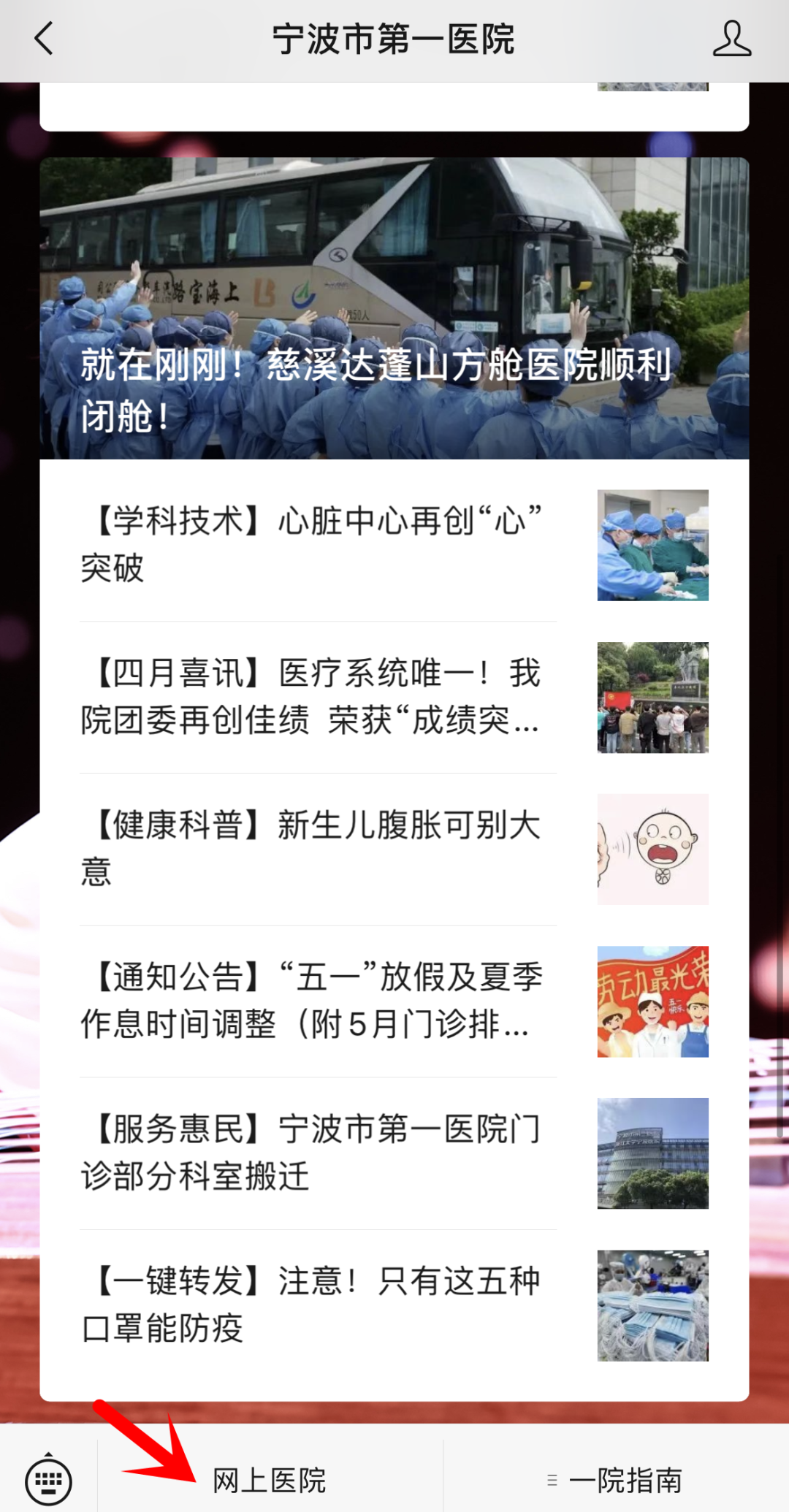 、訇P(guān)注“寧波市第一醫(yī)院”微信公眾號(hào),點(diǎn)擊“網(wǎng)上醫(yī)院”進(jìn)入主頁(yè)。