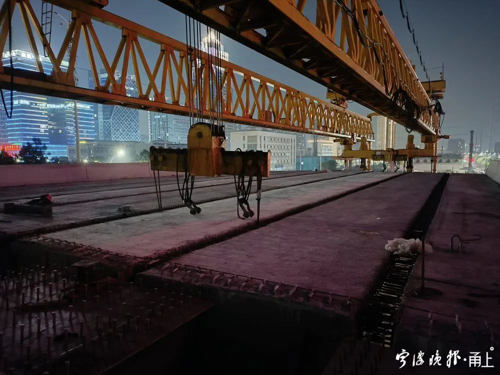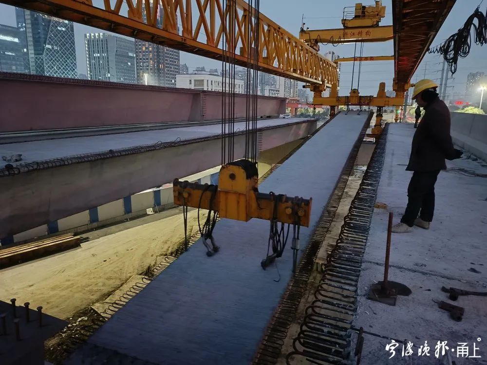 “它山堰路至天童南路段全長1070米,共計279片小箱梁、37片鋼箱梁。因項目地處南部商務(wù)區(qū),梁板架設(shè)過程中面臨了沿線交通量大、道口情況復(fù)雜、邊通車邊施工等諸多挑戰(zhàn),我們通過采取實時管控、分流引導(dǎo)和時段調(diào)整等舉措,確保箱梁架設(shè)的安全性。經(jīng)過連續(xù)兩晚的徹夜搶工,終于順利完成了高架結(jié)構(gòu)的架設(shè)。”鄞州大道快速路工程鄞州段建設(shè)單位項目負(fù)責(zé)人介紹。