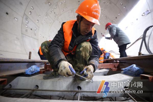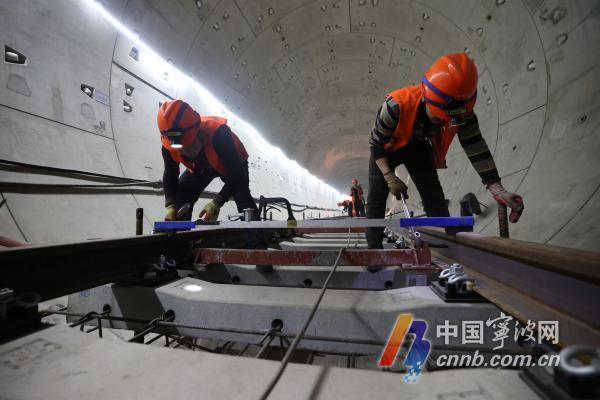 沉重的軌枕被吊入軌道,測(cè)量、捆扎……在寧波軌道交通3號(hào)線二期興海南路站約1000平方米的鋪軌基地,汽車(chē)吊不停卸貨、吊裝,工人們忙著安裝、澆筑,一派熱火朝天景象。
