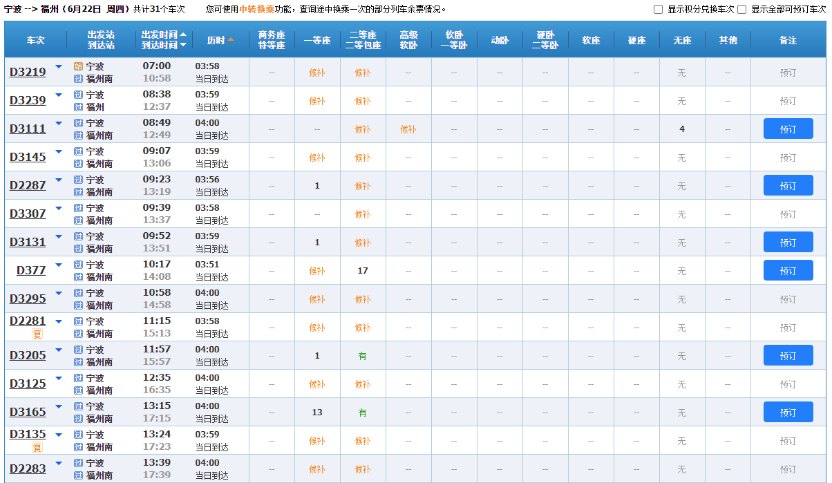端午假期首日,寧波開(kāi)往福州的大部分車次車票已售罄。