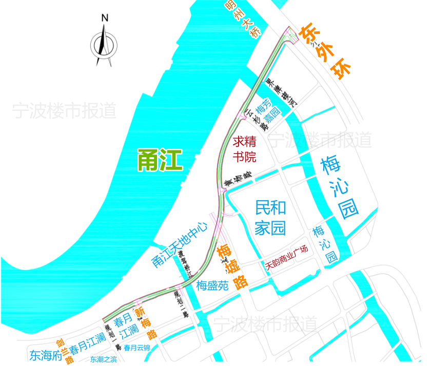 要新建的這段甬江大道,西起劍蘭路東側規(guī)劃路,順接已建段甬江大道,東至現狀東外環(huán),全長約2.1公里。線路走向圖示如下: