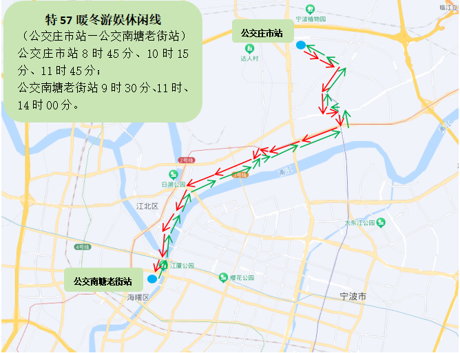站點設(shè)置:公交莊市站、柳岸晨韻、湯家廟、莊市淺水灣小區(qū)、莊市菜市場、鑫隆花園、清泉花園西大門(市大學(xué)科技園)、路林市場、怡江新村、孔浦、寧大附屬第一醫(yī)院外灘院區(qū)、老外灘(寧波美術(shù)館)、江廈公園、公交南塘老街站。