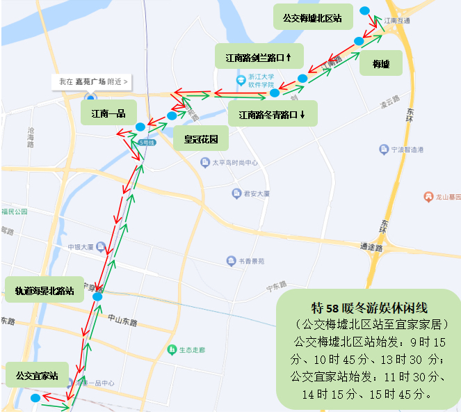 站點設(shè)置:公交梅墟北區(qū)站、梅墟、江南路冬青路口↓、江南路劍蘭路口↑、皇冠花園、江南一品、軌道海晏北路站、公交宜家站。