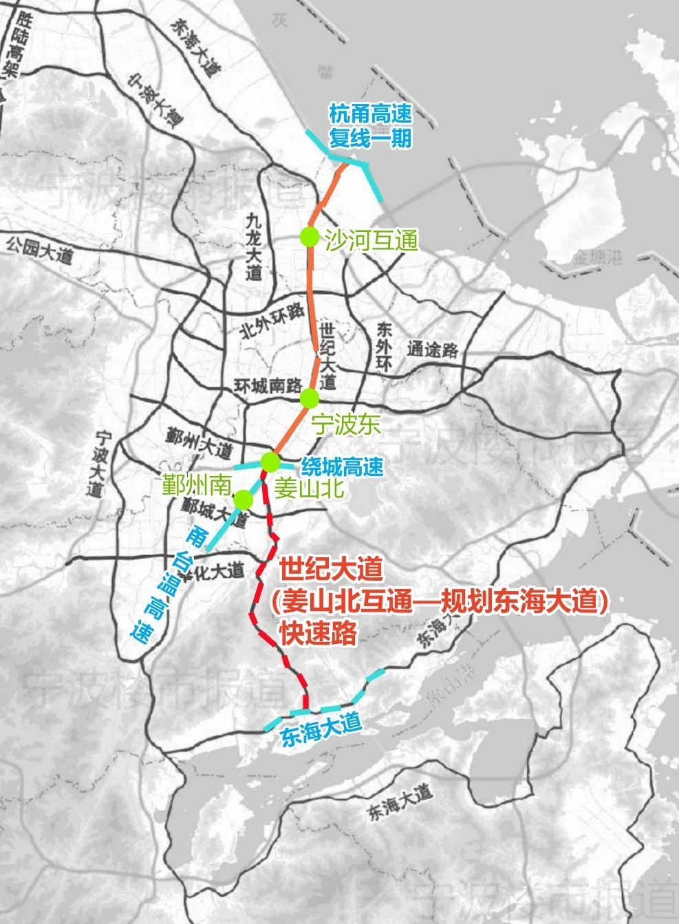 上圖中的全段世紀(jì)大道快速路,最北的一段——從沙河互通至澥浦接杭甬高速復(fù)線一期,前陣子已與興海路隧道、鄞城大道快速路(秋實(shí)路-明輝路)等工程一起啟動方案征集。