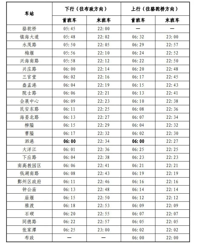 作為5號(hào)線延伸段,3號(hào)線二期開通運(yùn)營后,5號(hào)線全線單程運(yùn)行時(shí)間1小時(shí)3分23秒。布政站、駱駝橋站為兩端始發(fā)站,布政站首班車發(fā)車時(shí)間為6:00,末班車發(fā)車時(shí)間為22:00;駱駝橋站首班車發(fā)車時(shí)間為5:45,末班車發(fā)車時(shí)間為22:00。泗港站增開分別發(fā)往兩端的首班車,發(fā)車時(shí)間為6:00,維持不變。