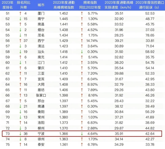 ▲根據(jù)百度地圖發(fā)布的《2023年度中國(guó)城市交通報(bào)告》顯示,寧波的通勤高峰交通擁堵情況在全國(guó)百城中排第73位,較前一年下降38位,穩(wěn)居最不擁堵的“新一線”城市。