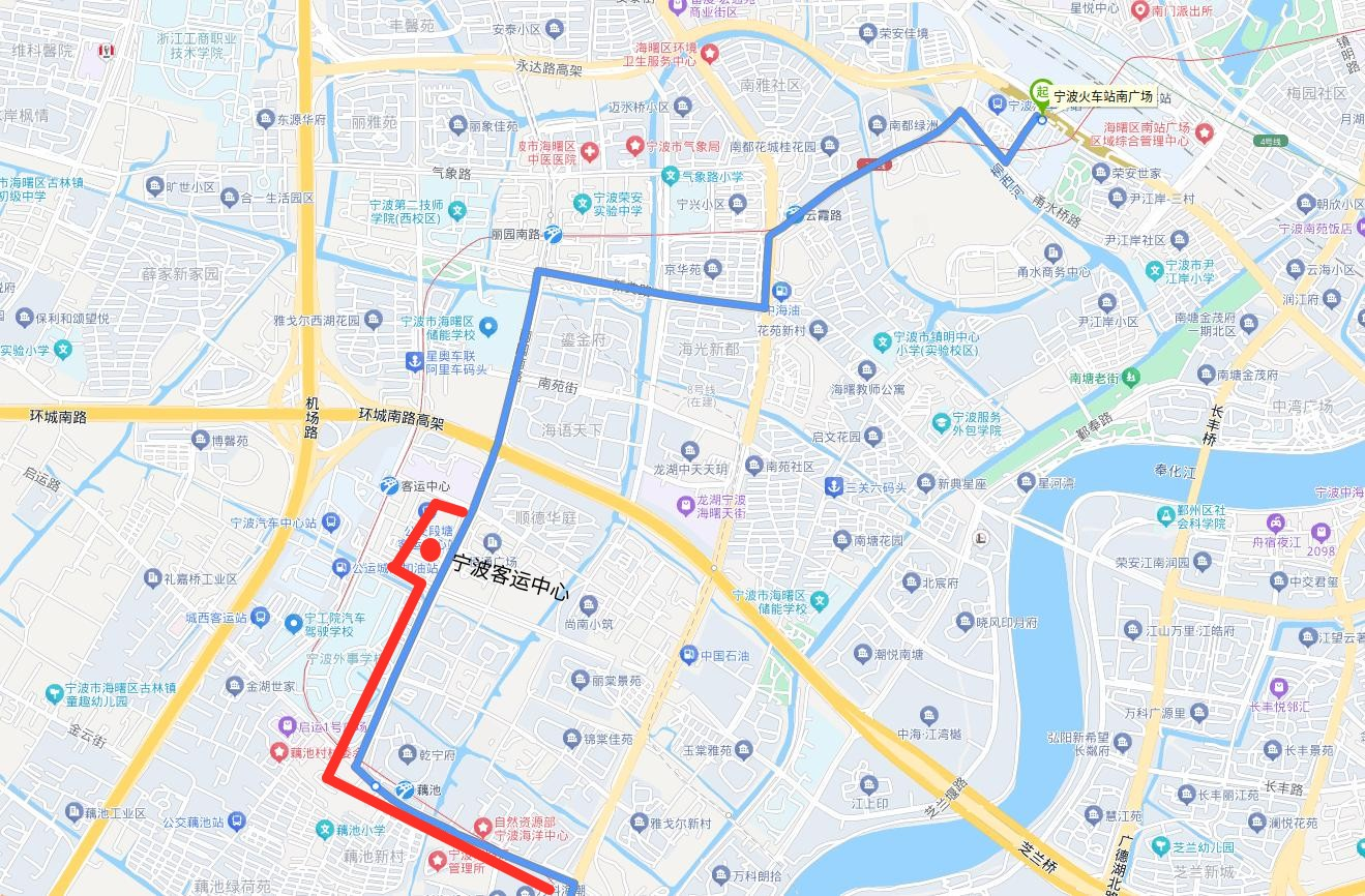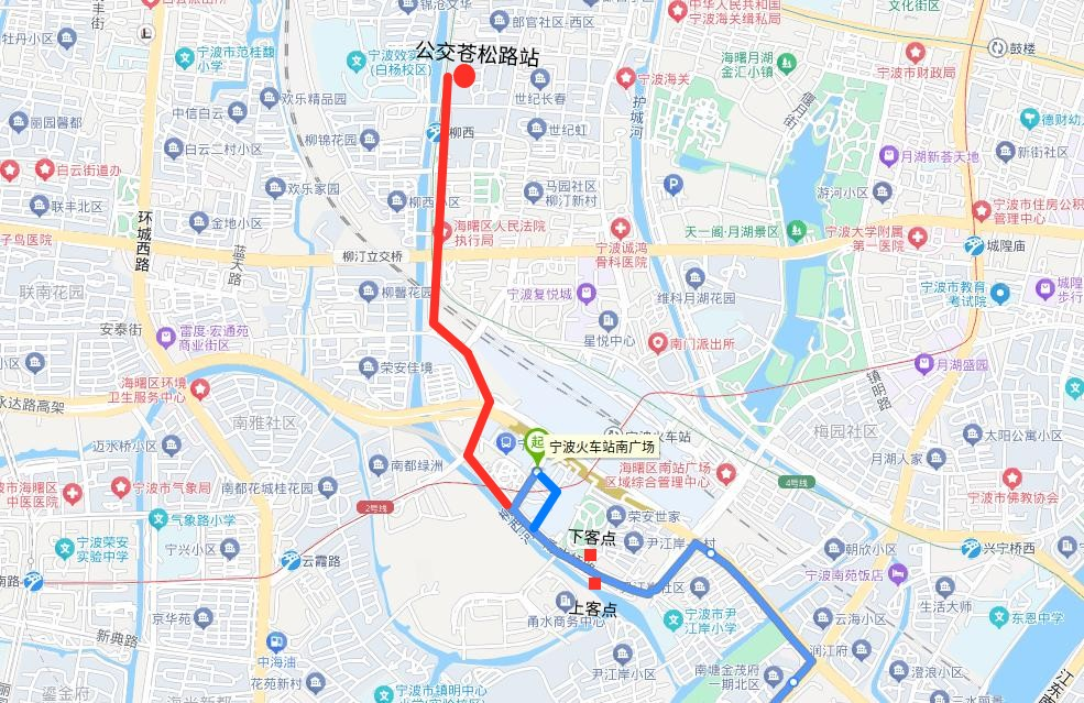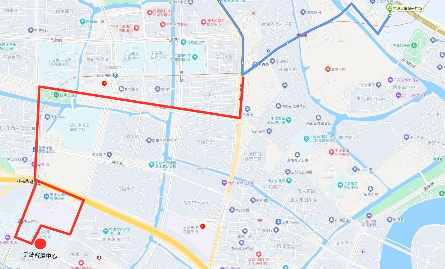 。ǘ┏蜂N部分麗園南路、新典路、環(huán)城西路、恒春街、蒼松路、甬水橋路走向及寧波火車站南廣場(chǎng)始發(fā)站。