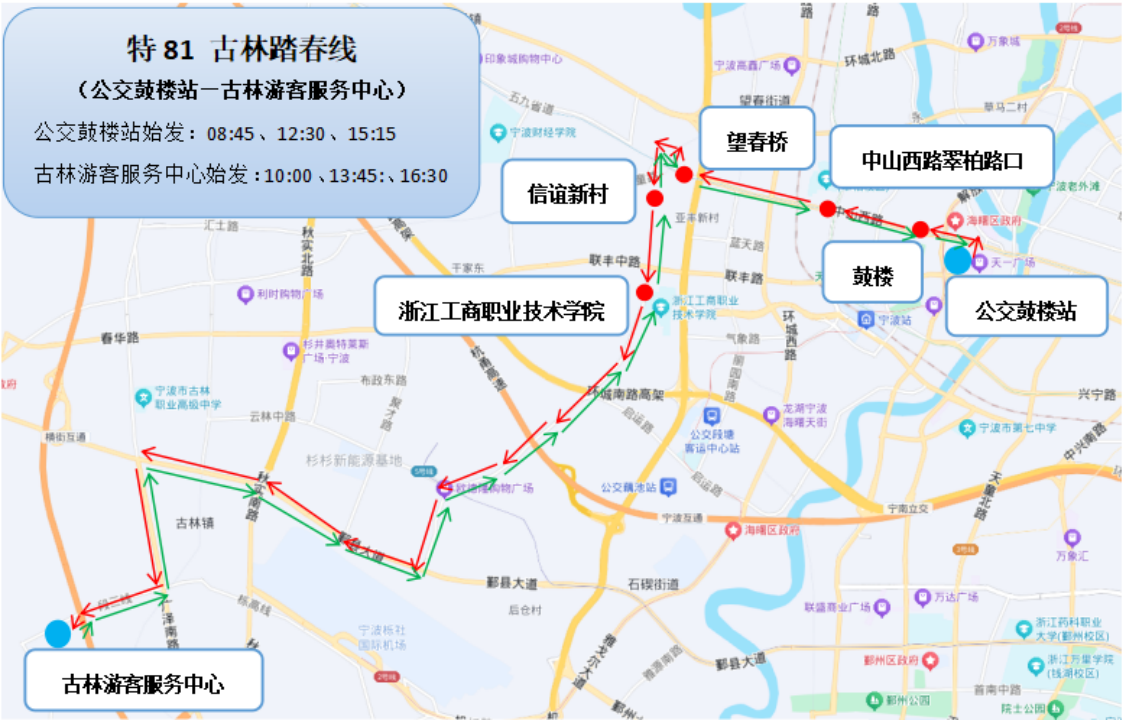 站點設置:公交鼓樓站、鼓樓、中山西路翠柏路口、望春橋、信誼新村、浙江工商職業(yè)技術學院、古林游客服務中心。