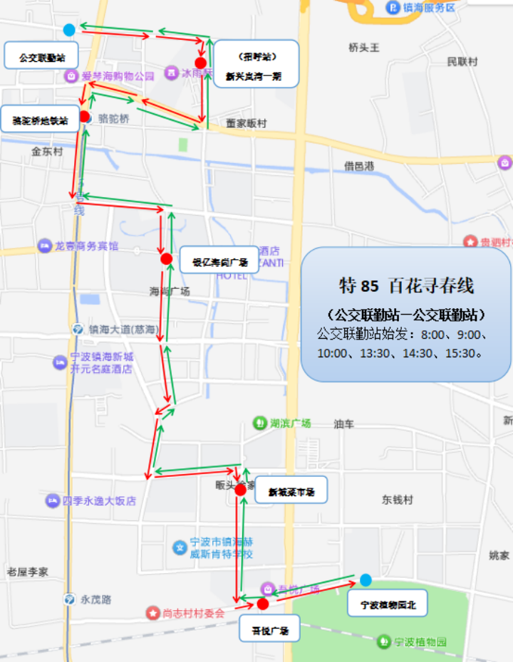 站點設置:公交聯(lián)勤站、新興嵐灣一期(招呼站)、駱駝橋地鐵站、銀億海尚廣場、新城菜市場、吾悅廣場、寧波植物園北。
