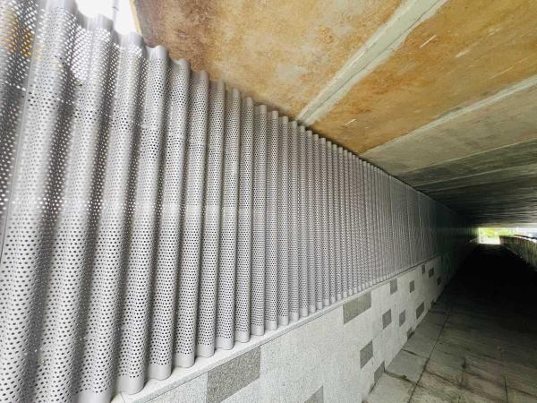 為提升景觀品質(zhì),在下穿通道工程中,市政園林管理科從設(shè)計(jì)到施工實(shí)施全過(guò)程指導(dǎo),在通道入口周邊種植了風(fēng)車茉莉、迷迭香等花境植物,精心打造綠化景觀。通道內(nèi)墻面采用圓形鏤空金屬板裝飾,既隱藏?zé)魩в衷鎏砻栏校归g通行更顯溫馨。
