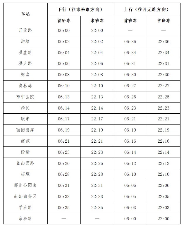 開元路站、寒松路站為8號線兩端始發(fā)站。兩端首班車發(fā)車時間為6:00,末班車發(fā)車時間為22:00,全程約38分鐘。開通初期,行車間隔為高峰期6分鐘、平峰期8分鐘,低峰期10分鐘。