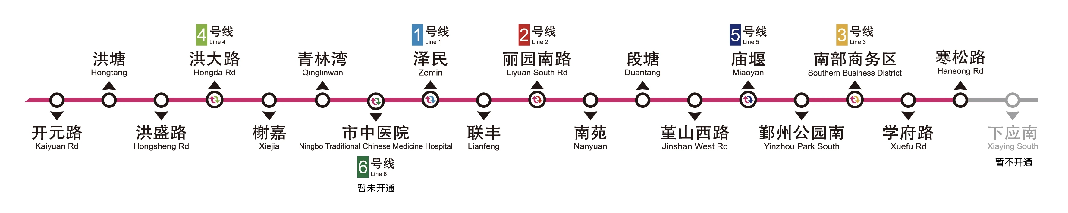 8號線一期與既有線均設(shè)有換乘:澤民站與1號線換乘,麗園南路站與2號線換乘,南部商務(wù)區(qū)站與3號線換乘,洪大路站與4號線換乘,廟堰站與5號線換乘。市中醫(yī)院站與未來建成的6號線換乘。