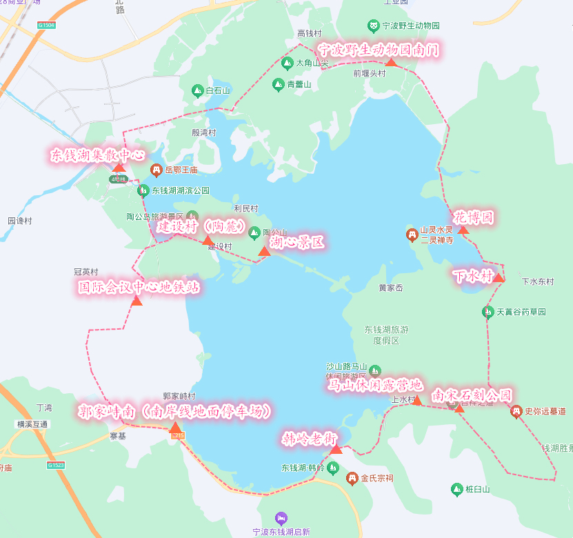 該線路及站點設置為:湖心景區(qū)→建設村(陶麓)→東錢湖集散中心→寧波野生動物園南門→花博園→下水村→南宋石刻公園→馬山休閑露營地→韓嶺老街→郭家峙南(南岸線地面停車場)→國際會議中心地鐵站→建設村(陶麓)→湖心景區(qū)。