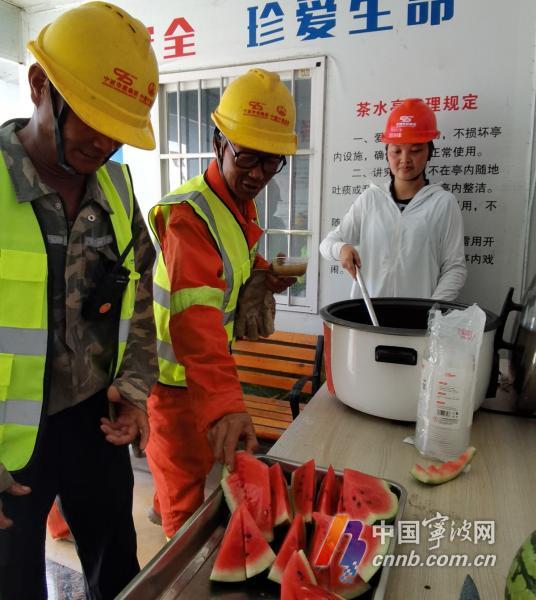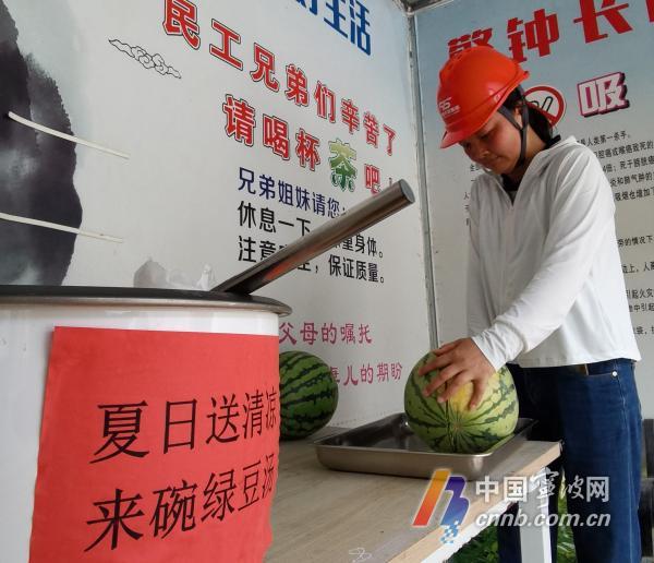 工地為工人師傅準備了綠豆湯和西瓜。劉波 攝
