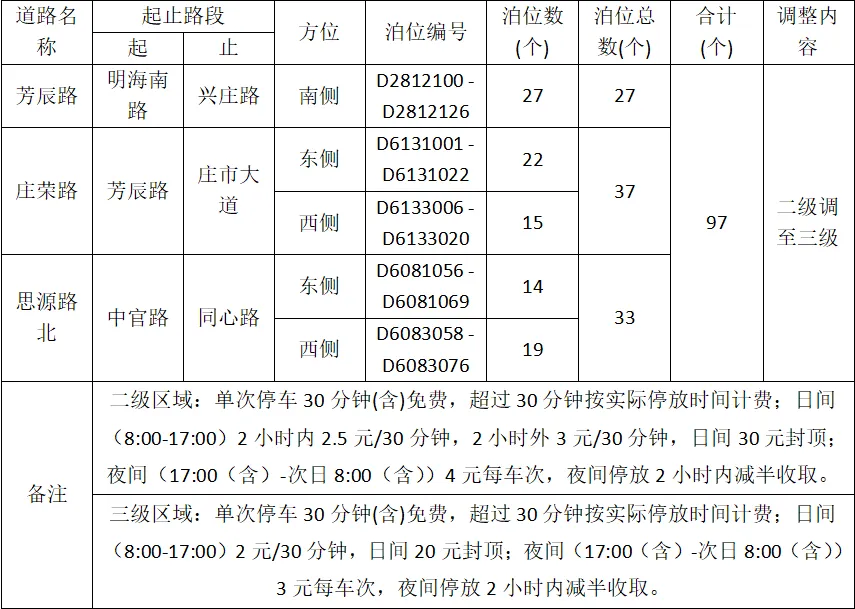 即日起調(diào)整芳辰路、莊榮路、思源路北路內(nèi)泊位收費(fèi)標(biāo)準(zhǔn)。本次調(diào)整泊位收費(fèi)標(biāo)準(zhǔn)公告如下: