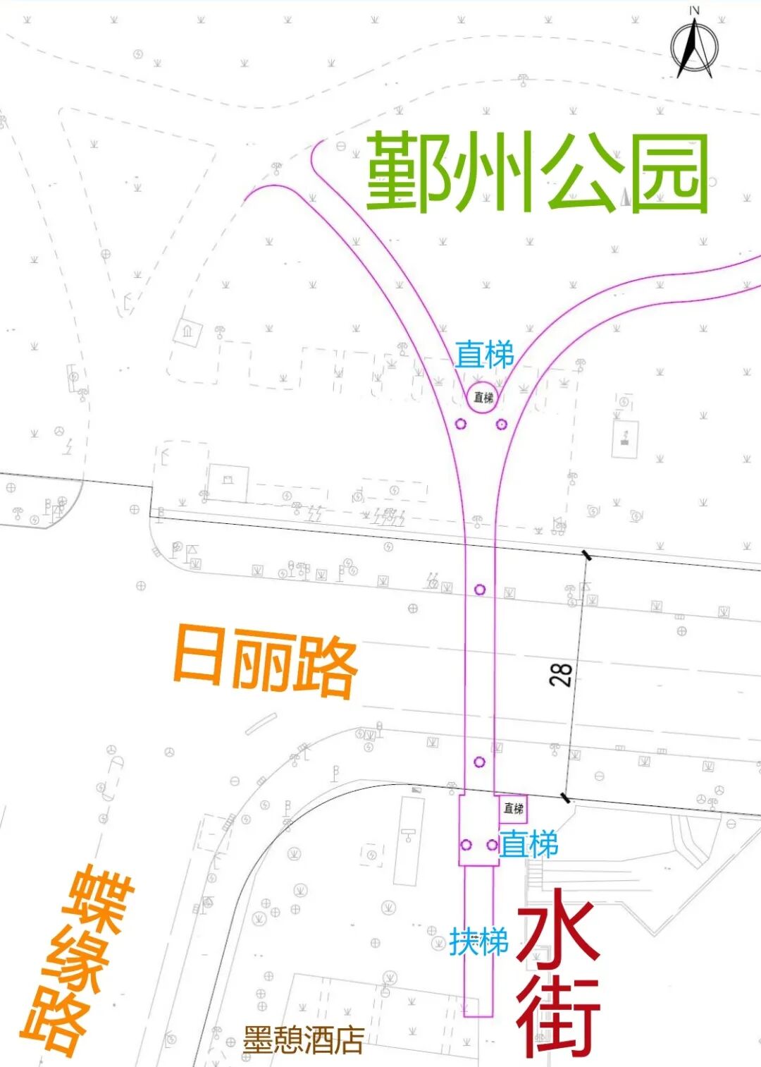 這座人行天橋跨日麗中路,南北向連通南商水街和鄞州公園,長約53米,設(shè)一部扶梯、兩部直梯,位置示意如下:
