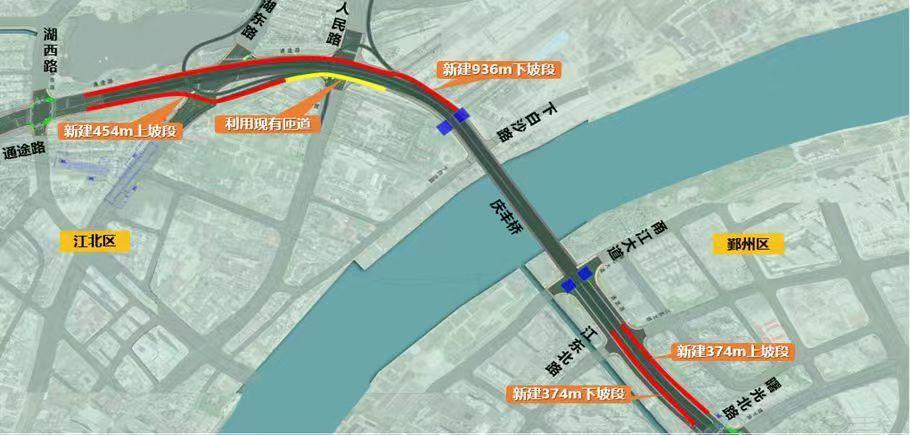 其中江北段北側(cè)匝道(含落地段)總長約936米,南側(cè)匝道(含落地段)總長約456米;鄞州段兩側(cè)匝道(含落地段)總長均約374米。