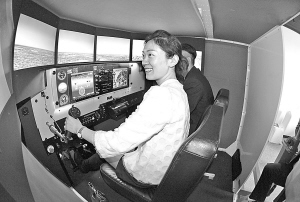 | 圖為一市民正在模擬機(jī)內(nèi)體驗(yàn)駕駛飛機(jī)! (陳章升 攝) |