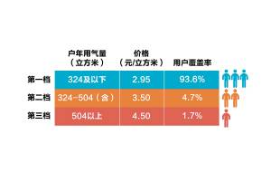 居民階梯氣價制度以戶為單位(對應(yīng)的家庭戶籍人口為4人),以年度為計量周期,確定三檔氣量和對應(yīng)的價格,各檔價格按用氣量實行超額累進加價。第一檔、第二檔、第三檔年用氣量分別為324立方米及以下、324立方米至504立方米(含)、504立方米以上,對應(yīng)的價格分別為每立方米2.95元、3.5元和4.5元。按2014年寧波市區(qū)居民用戶實際用氣量數(shù)據(jù)測算,各檔氣量用戶覆蓋率分別達到93.6%、4.7%及1.7%。階梯氣價方案按照“保基本、促節(jié)約”的原則確定。各檔氣價比價關(guān)系基本保持在國家發(fā)展改革委指導(dǎo)意見要求的1:1.2:1.5水平。