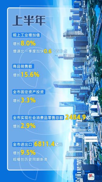 上半年,全市規(guī)模以上工業(yè)增加值同比增長8.0%,比一季度加快0.6個(gè)百分點(diǎn)。