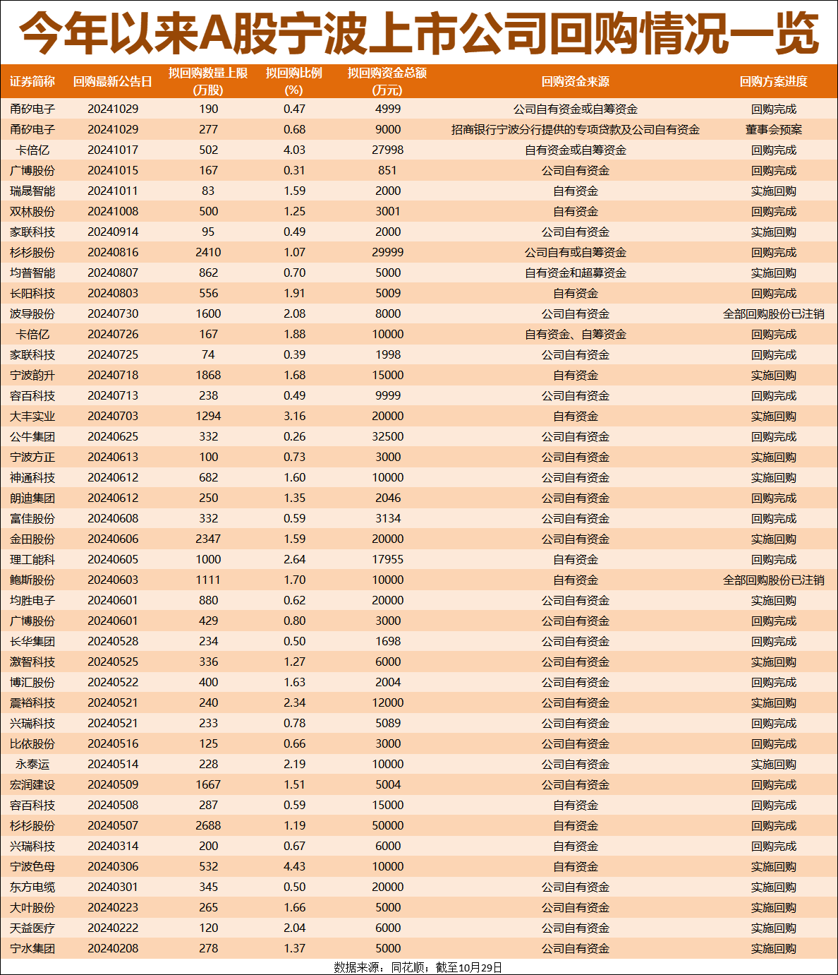 附:今年以來A股寧波上市公司回購情況一覽