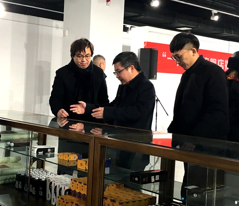 ↑↑↑今天,在一得閣旗艦店入駐榮寶齋(寧波)現(xiàn)場,一得閣董事長孟繁韶(左一)介紹旗下產(chǎn)品。